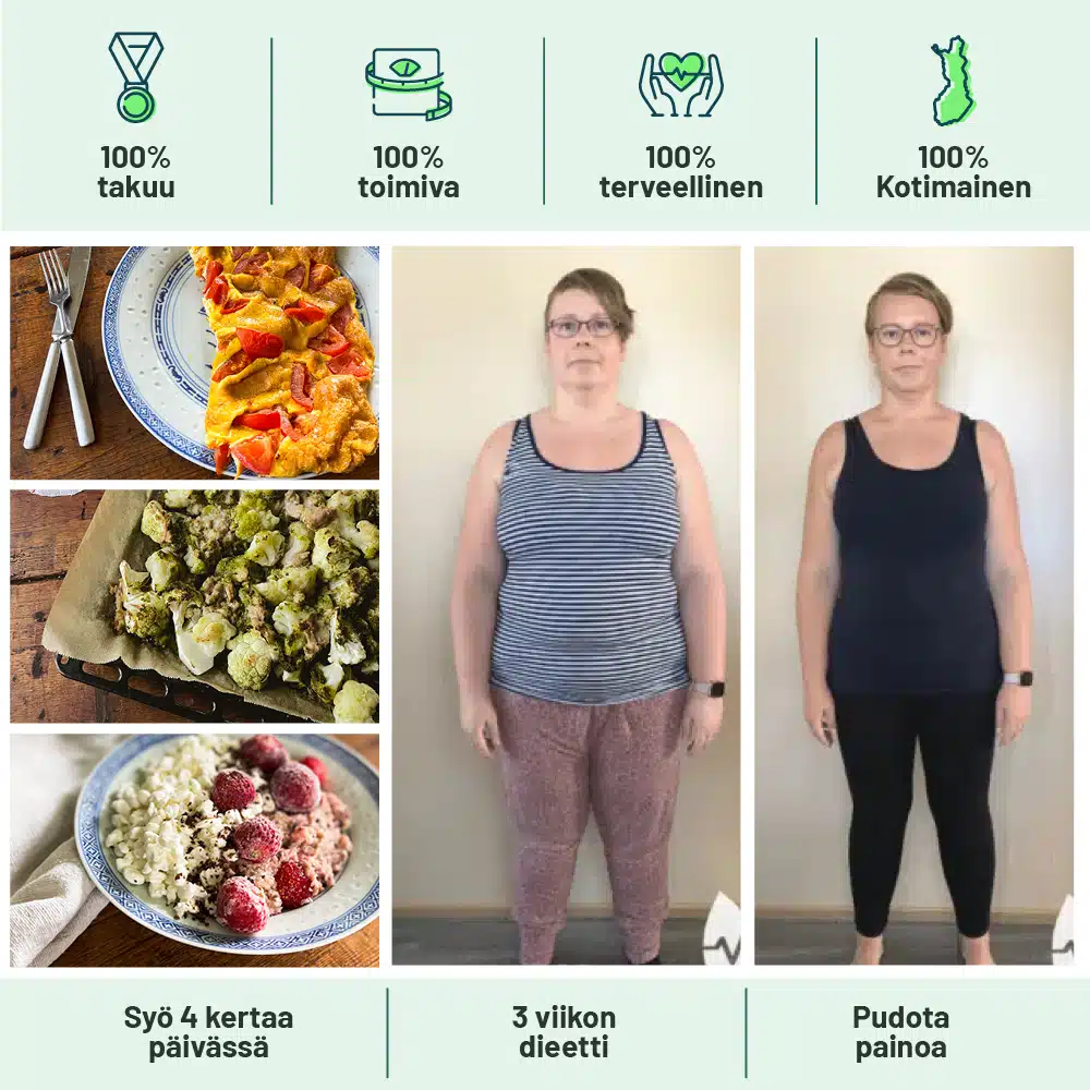 ”Epäilin voiko 3 viikossa oikeasti pudota painoa, koska yleensä itsellä kestää useampi viikko nähdä mitään muutosta ruokavaliolla. Siksi yllätyin, kun toisen viikon lopulla alkoi housut tuntumaan väljiltä.” – Mirja K.